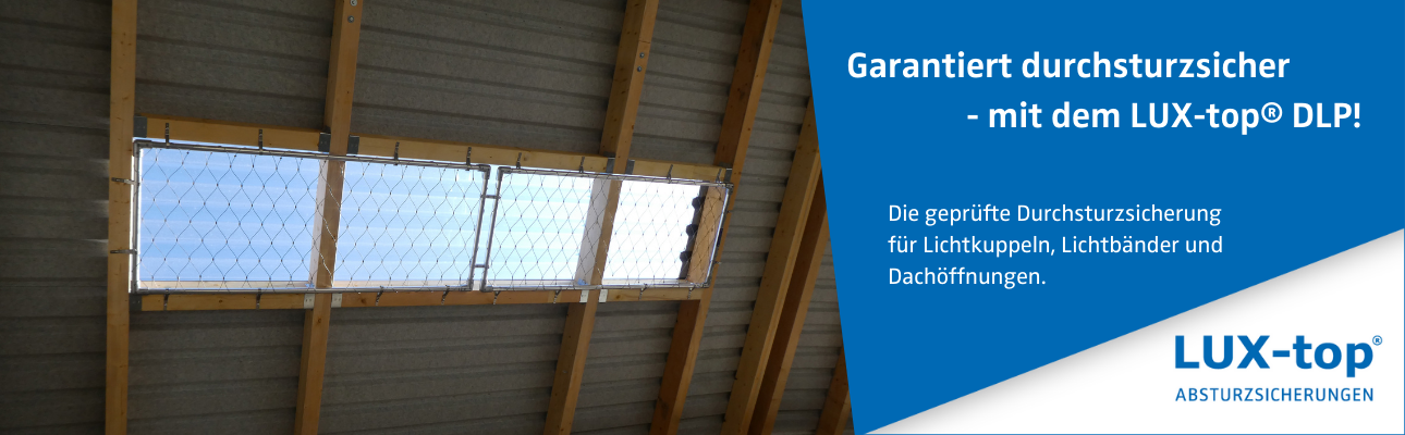 LUX-top® DLP ist eine nach GS-BAU-18 geprüfte und zertifizierte Durchsturzsicherung, speziell entwickelt für Lichtkuppeln, Lichtbänder sowie Rauch- und Wärmeabzugsanlagen. Ihr größter Vorteil: Die Nachrüstung ist besonders unkompliziert. Die Montage erfolgt von unten – ohne Öffnen oder Abnehmen der Lichtkuppel. So bleibt sowohl die Dachhaut als auch die Lichtkuppel unversehrt und Undichtigkeiten werden vermieden.