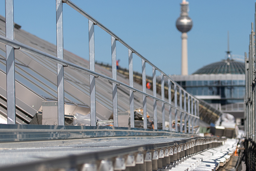 Ces combinaisons créent des concepts de sécurité globaux – planifiables individuellement, économiques à mettre en œuvre et fiables à long terme. L’accès sécurisé aux installations techniques sur les toitures métalliques, telles que les climatiseurs, les antennes ou les paratonnerres, est également garanti à tout moment grâce à la voie de maintenance.
